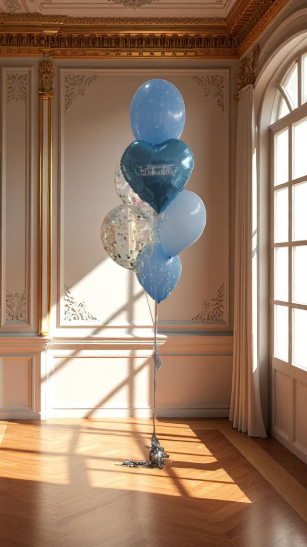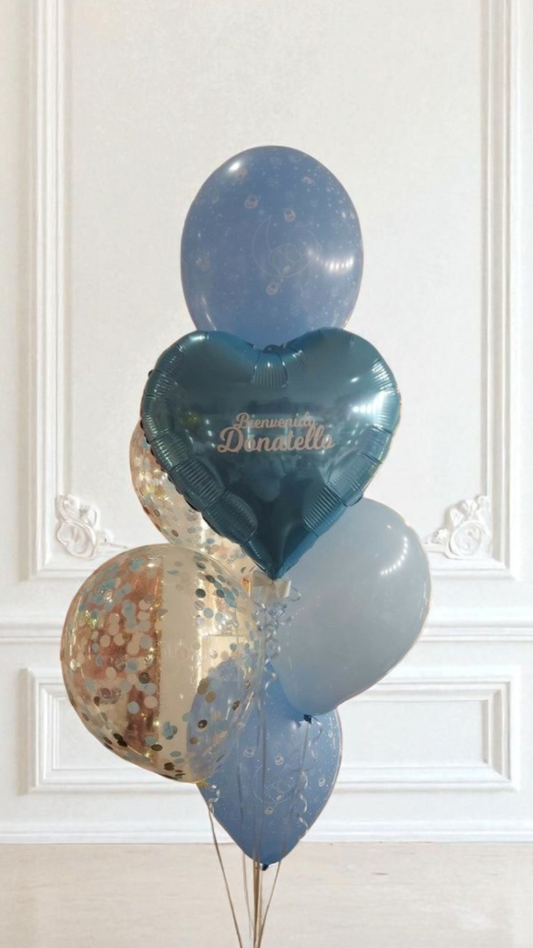 Este Bouquet incluye 3 globos de latex perlados + 2 transparentes con confetti + globo metalizado estrella o corazon.