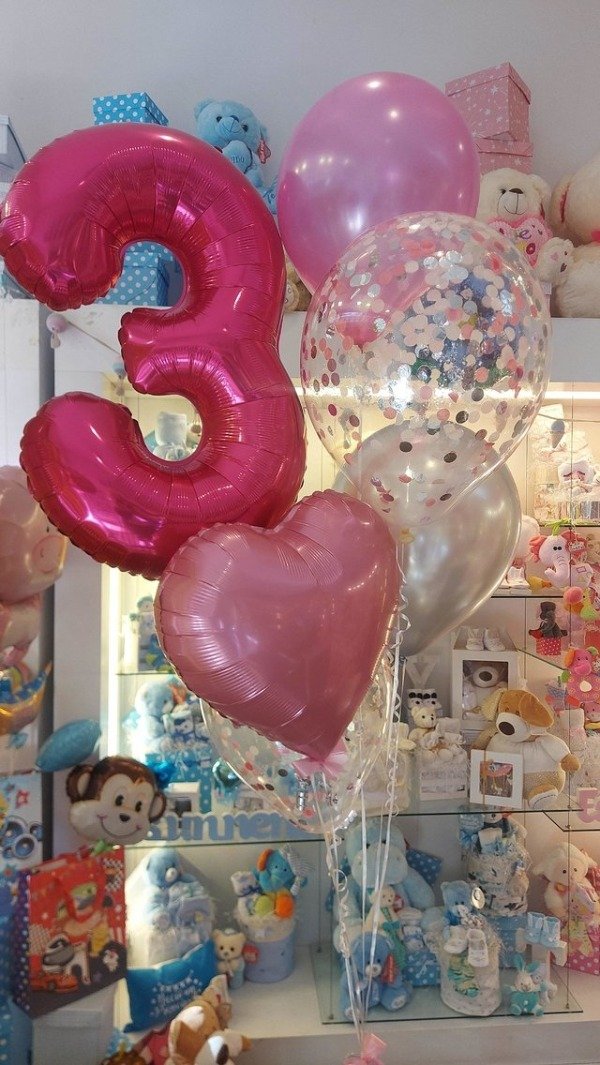 Este Bouquet esta formado por 1 Numero de 75cm + 1 Globo de látex + 1 Globo Chrome+ 2 transparentes con confetti + 1 metalizado Corazon personalizado.