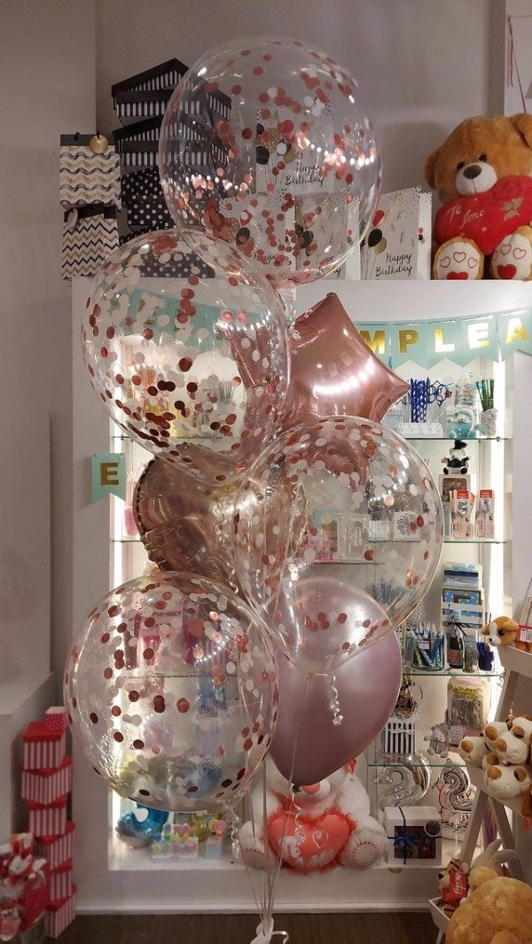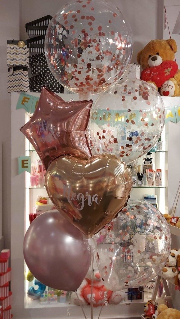 1 Burbuja Cristal + Globo de Látex Perlados lisos + 3 transparentes con confetti + 2 Globos Metalizados Personalizado (corazón o estrella )