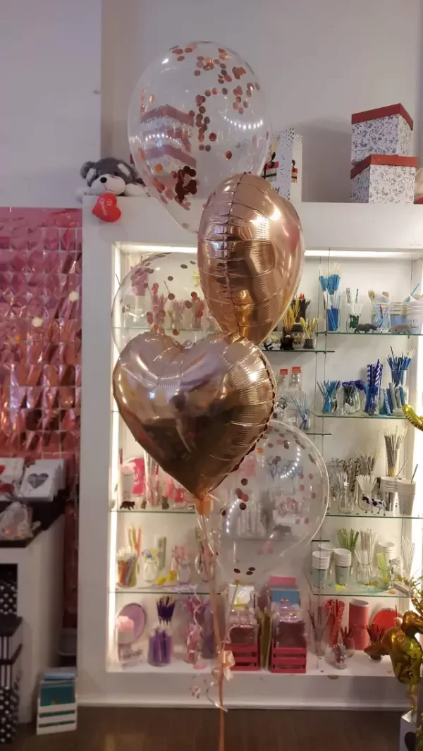 Este Bouquet incluye: 2 estrellas o corazones metalizados + 3 globos de látex con confetti, Colores a eleccion. IMPORTANTE! TODOS NUESTROS BOUQUETS LLEVAN UN TRATAMIENTO DE LARGA DURACION PARA LOS GLOBOS DE LATEX, DE ESA MANERA SE ALARGA EL TIEMPO DE FLOTACION DE LOS MISMOS A 3 DIAS