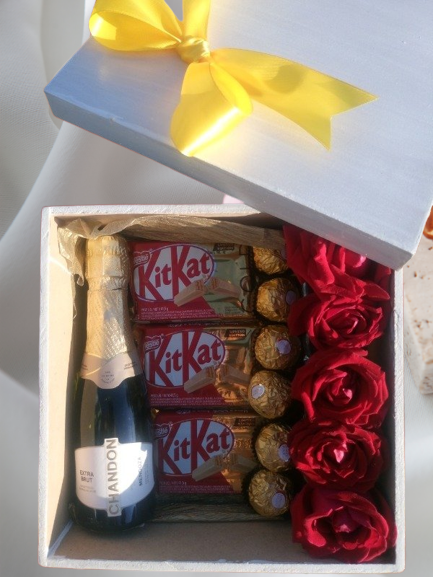 ESTA HERMOSA BOX, REALIZADA CON CAJA DE MADERA ARTESANALMENTE PINTADA CONTIENE, ADEMÁS DE 5 PERFUMADAS ROSAS NATURALES, EXQUISITA BEBIDA Y DELICIOSOS CHOCOLATES KIT KAT Y FERREROS.