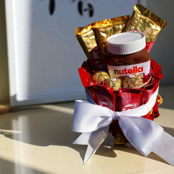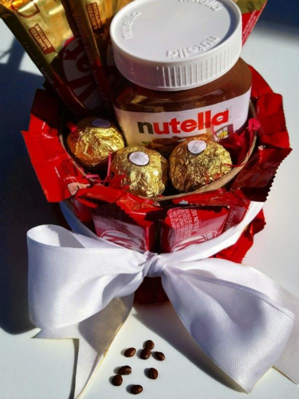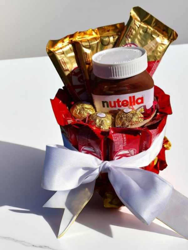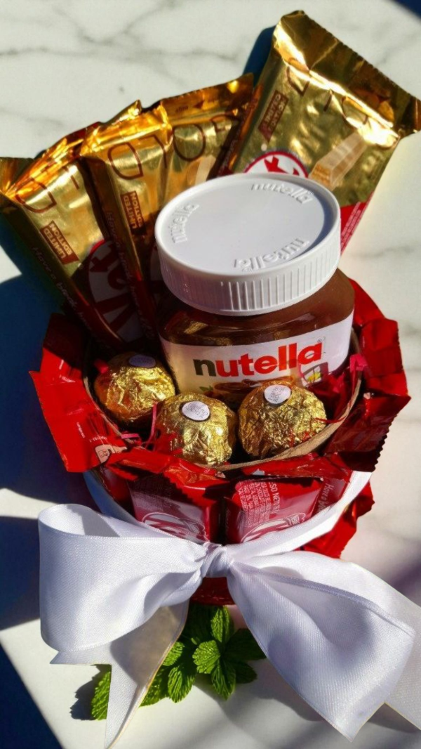 Esta torta está realizada con 11 KIT KAT MINI + 3 KIT KAT GOLD + 1 NUTELLA + 3 chocolates FERRERO ROCHER.
